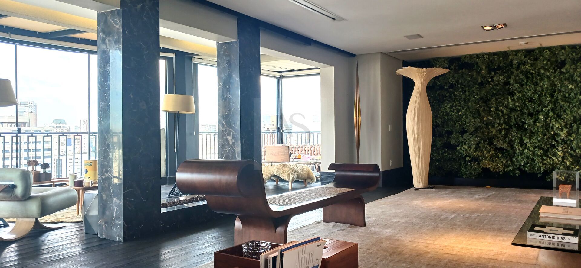 Planejada nos mínimos detalhes, ela conta com elevador panorâmico e uma lareira a gás revestida de mármore Bronze Armani. Piso nobre de madeira traz aconchego ao apartamento.