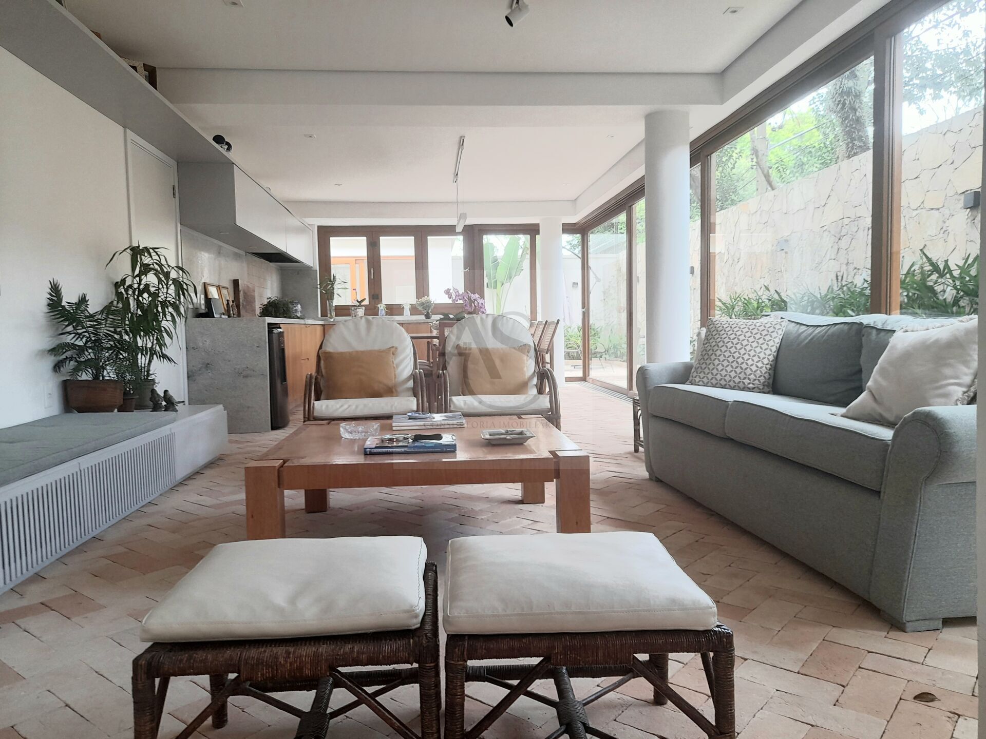 A casa está linda, projeto do TRIA Arquitetura, com ampla iluminação natural , os elementos naturais foram preservados e absorvidos no projeto, pedras, e vidros, proporcionando completa integração dos ambientes externos e internos, e atmosfera agradável de aconchego, sofisticação